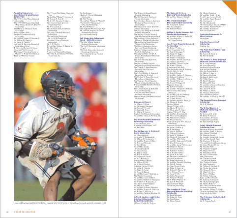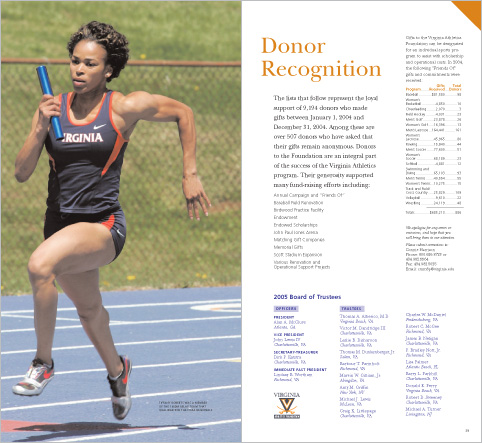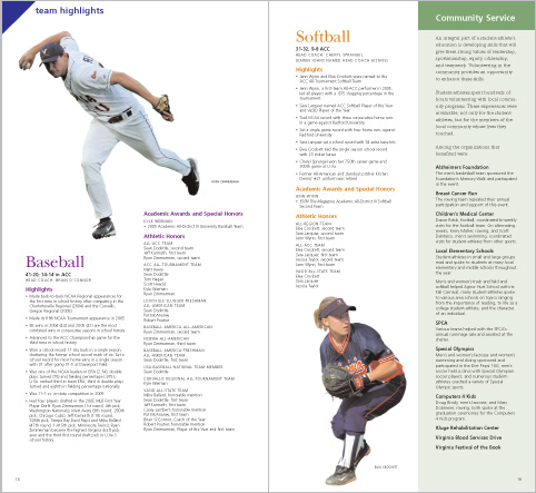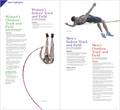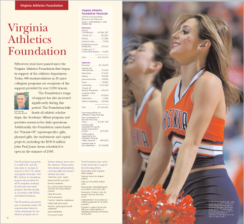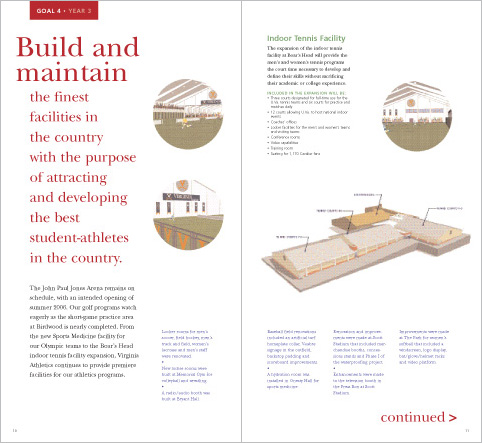 U.Va. Athletics had a great year, and the client wanted to include all of the season’s highlights. The text was numerous short articles; one spread might feature long-range goals, a student-athlete profile, team statistics, and a business plan.