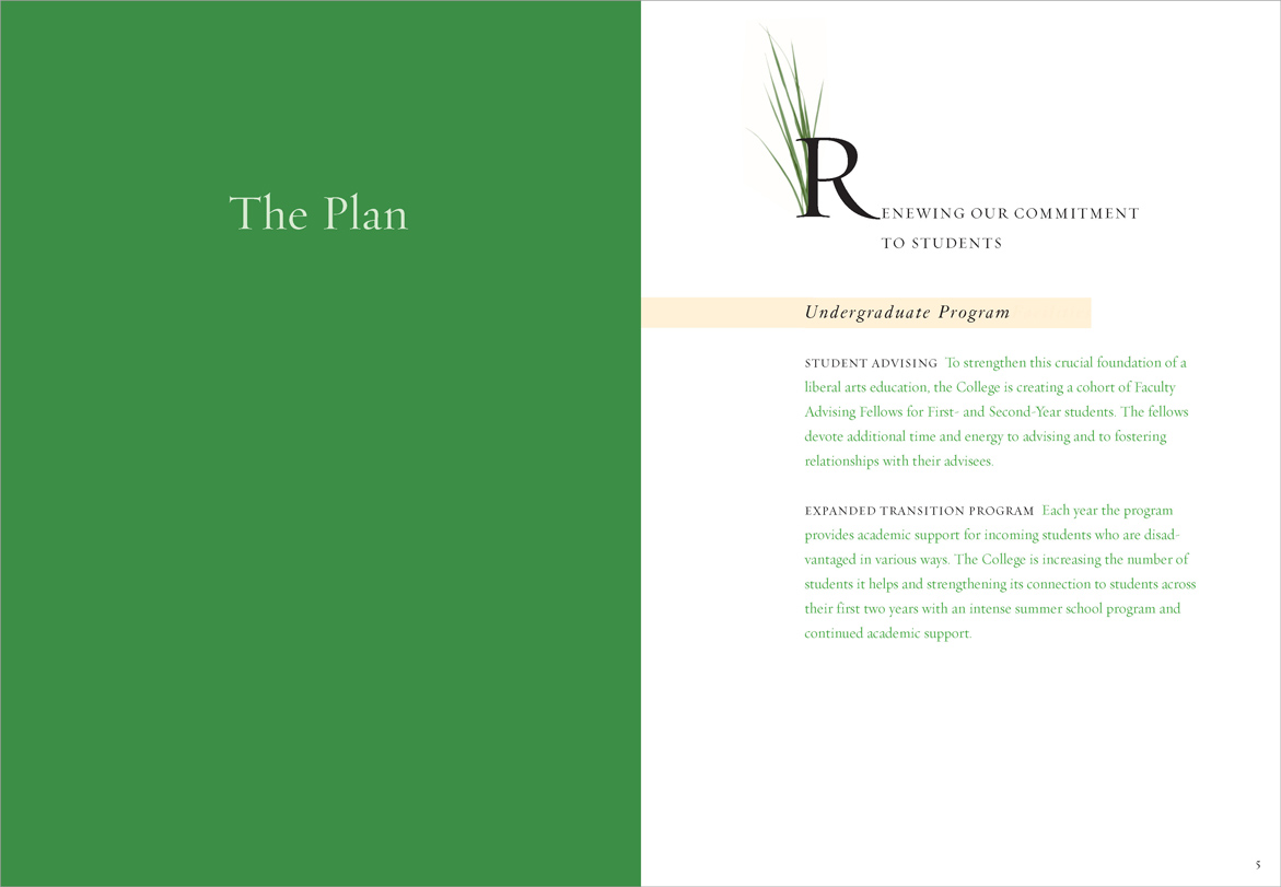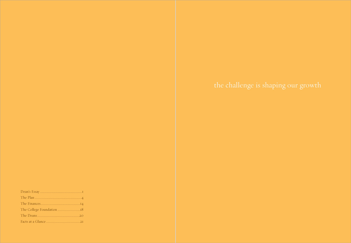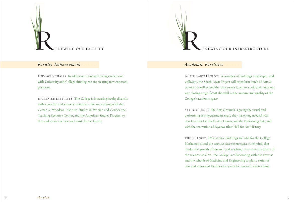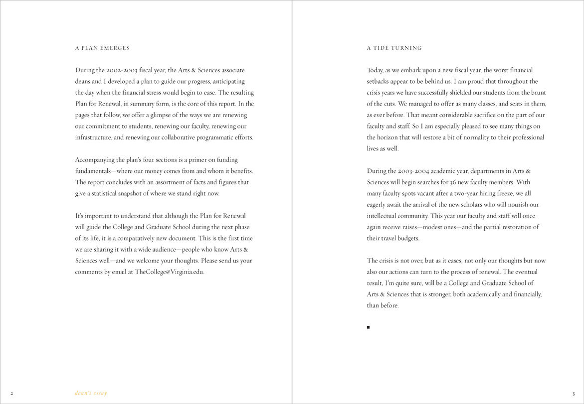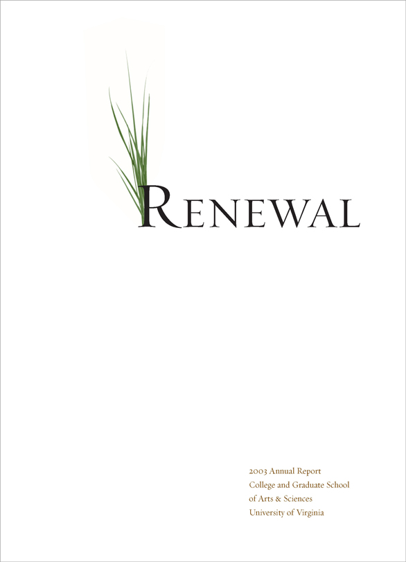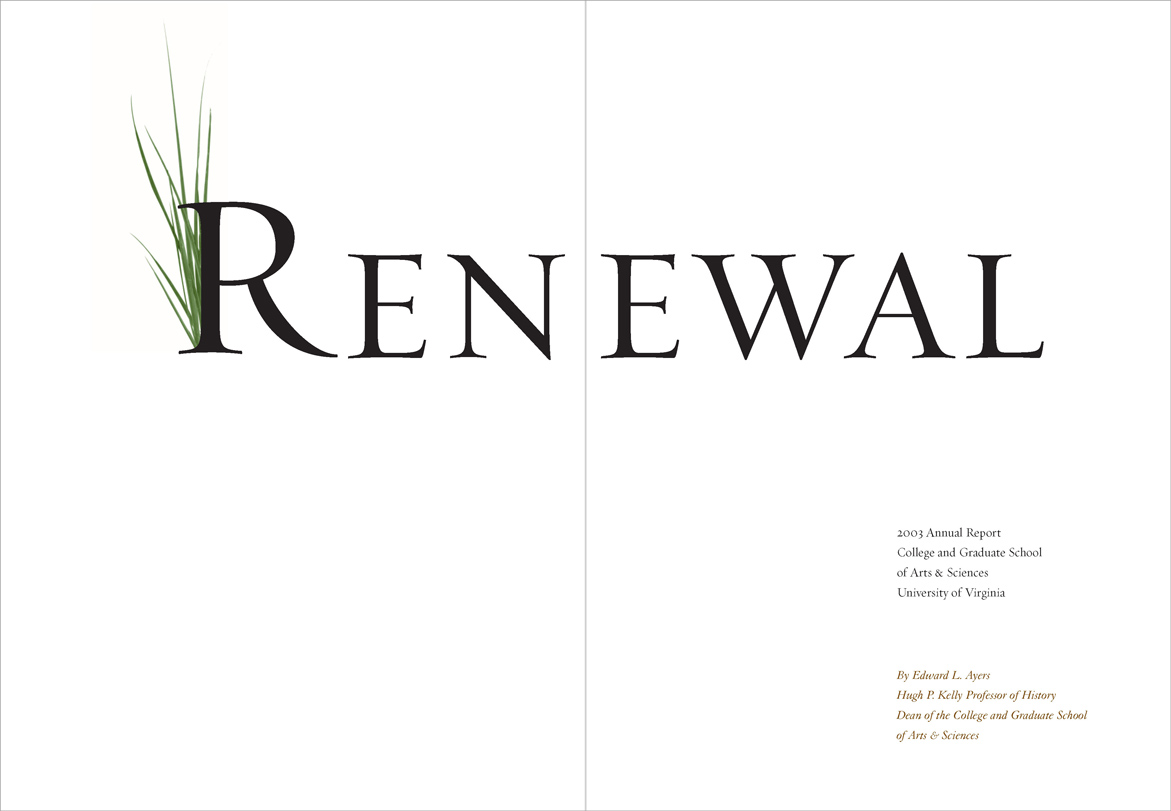 The University was suffering from state budget cuts and a hiring freeze was in effect; a glossy, photo-filled report was inappropriate. “Renewal” printed in 4-PMS colors. Different colors of type highlighted hierarchies of information in the text.