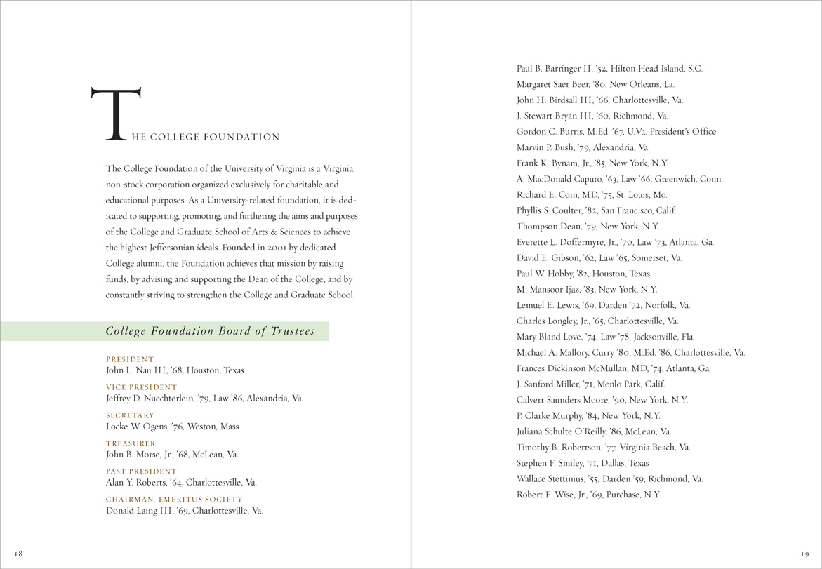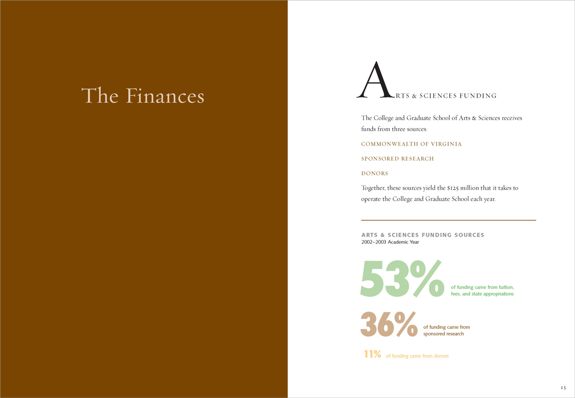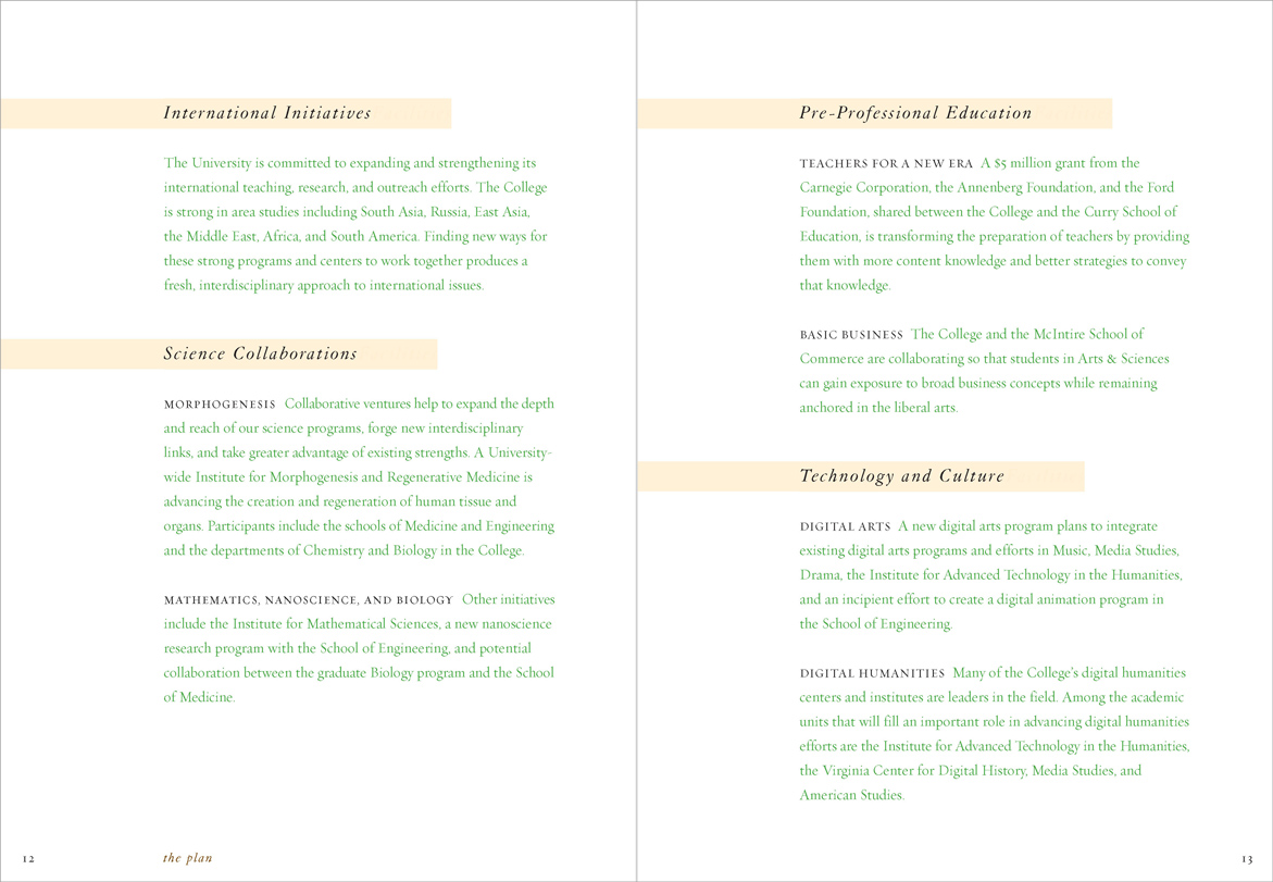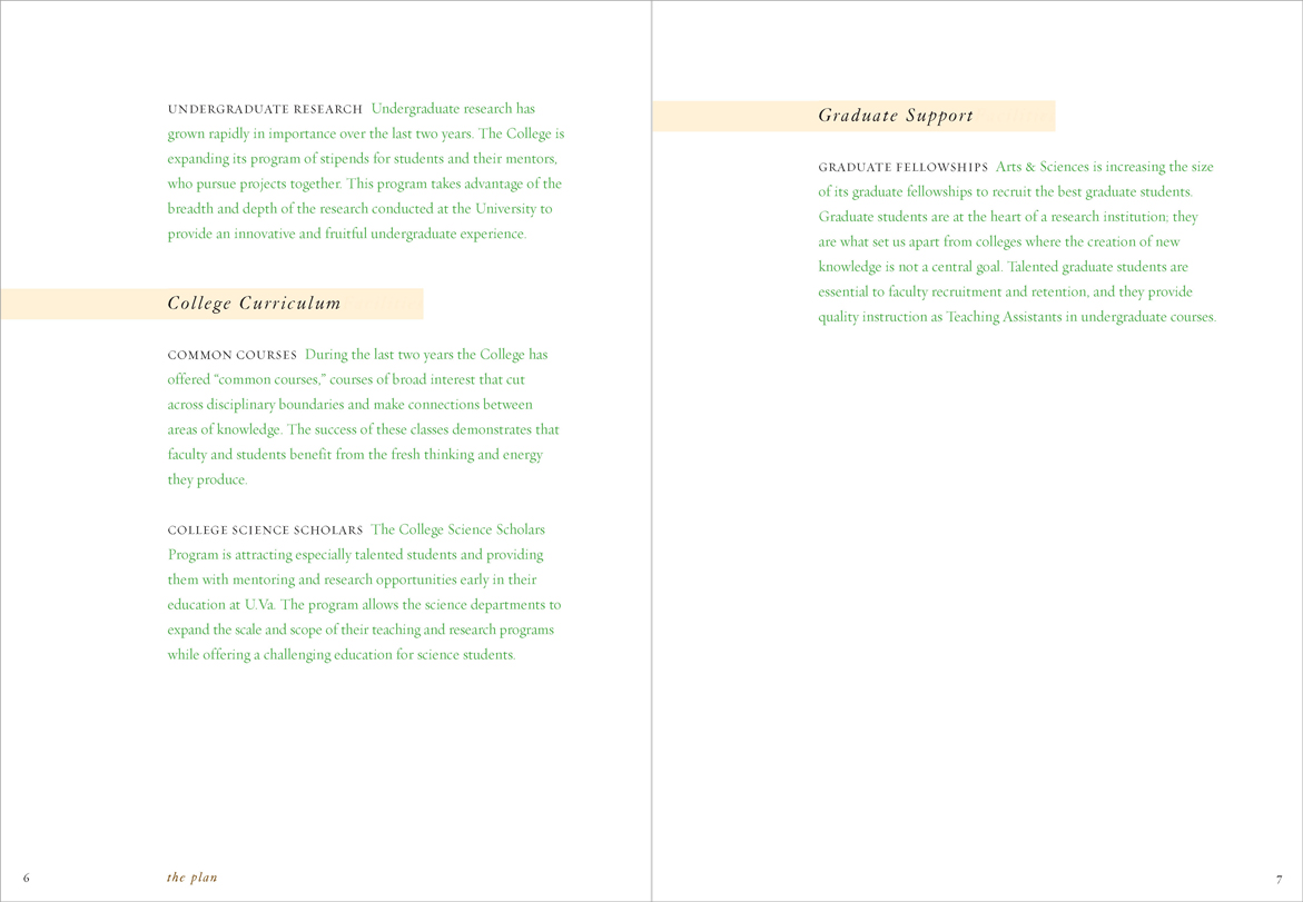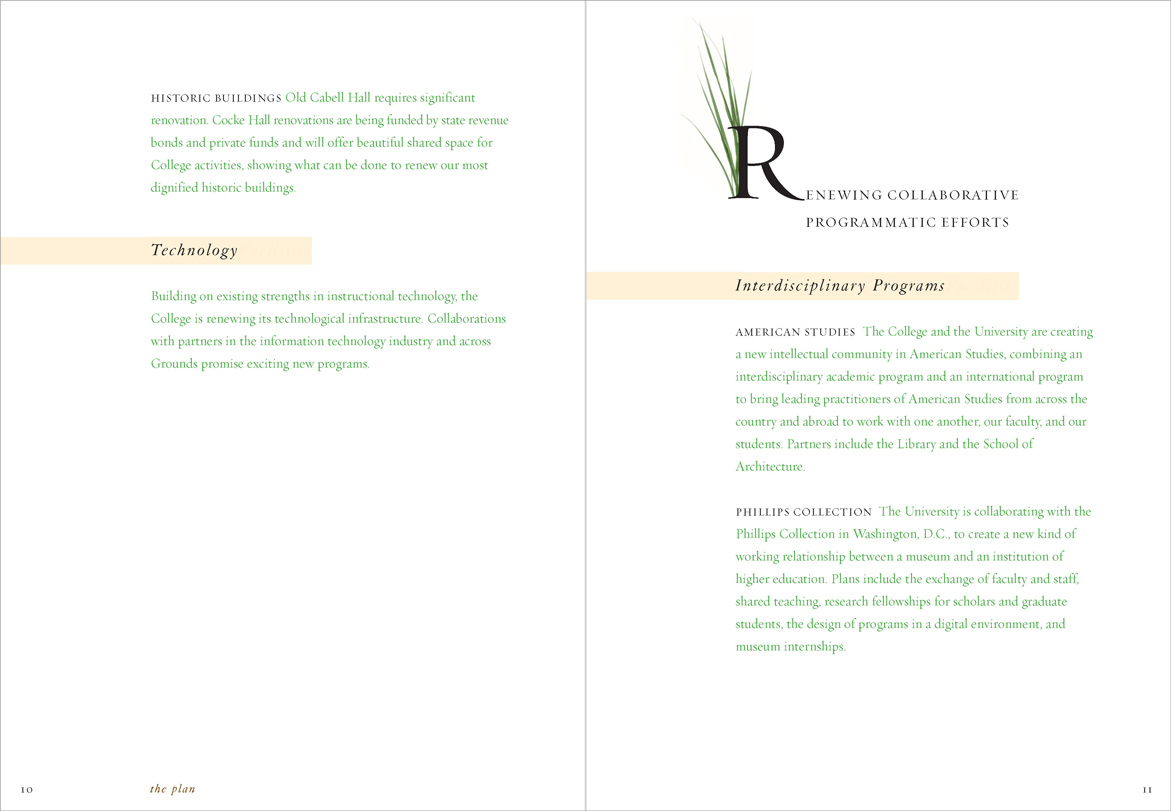 The University was suffering from state budget cuts and a hiring freeze was in effect; a glossy, photo-filled report was inappropriate. “Renewal” printed in 4-PMS colors. Different colors of type highlighted hierarchies of information in the text.