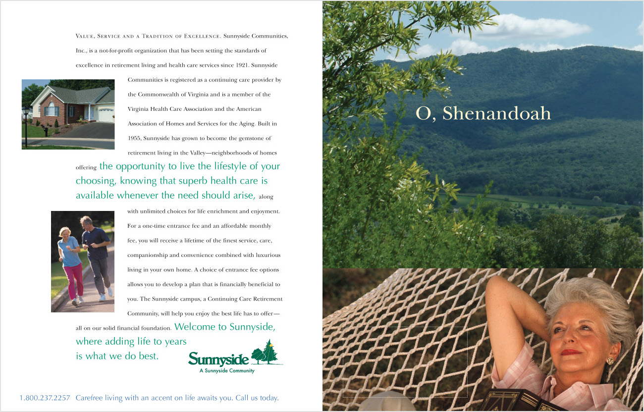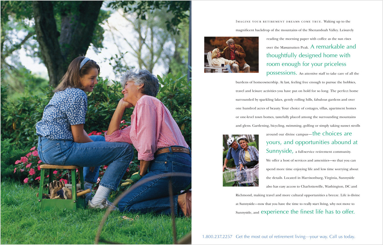 For the senior audience, the type is large and the line spacing is generous. The bright and open page layouts reflect the feel of the residences -- light-filled and spacious. The inside back cover features a pocket folder.