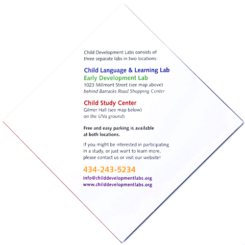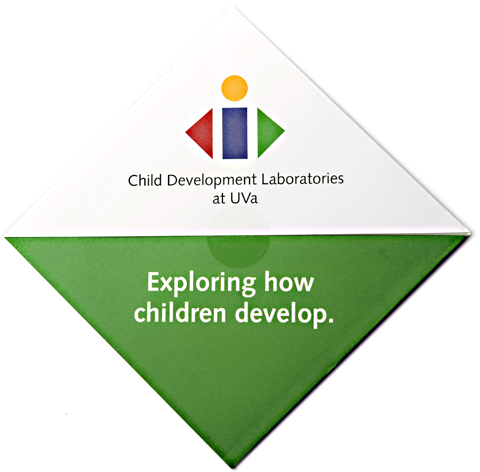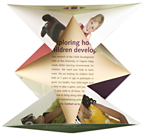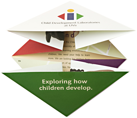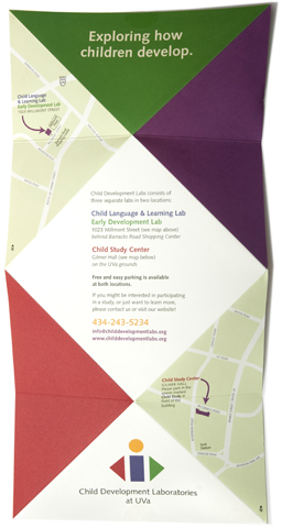 The Child Development Labs at the University of Virginia needed to recruit young children to participate in research projects. This brochure uses a folding pattern to reinforce the client’s message: research projects are fun, active and engaging.